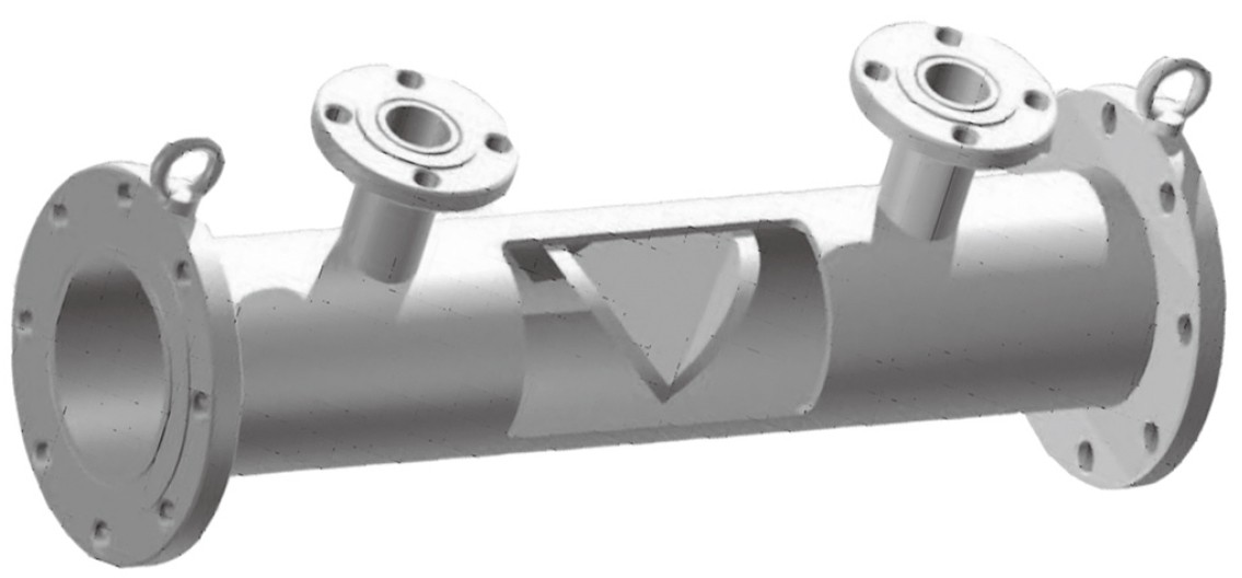 The flow element consists of a body and wedge flow restriction. This restriction creates a differential pressure in proportion to the square of the volumetric flow rate. The wedge restriction has no critical surface dimensions, or sharp edges, that will affect measurement accuracy as the result of normally expected wear.