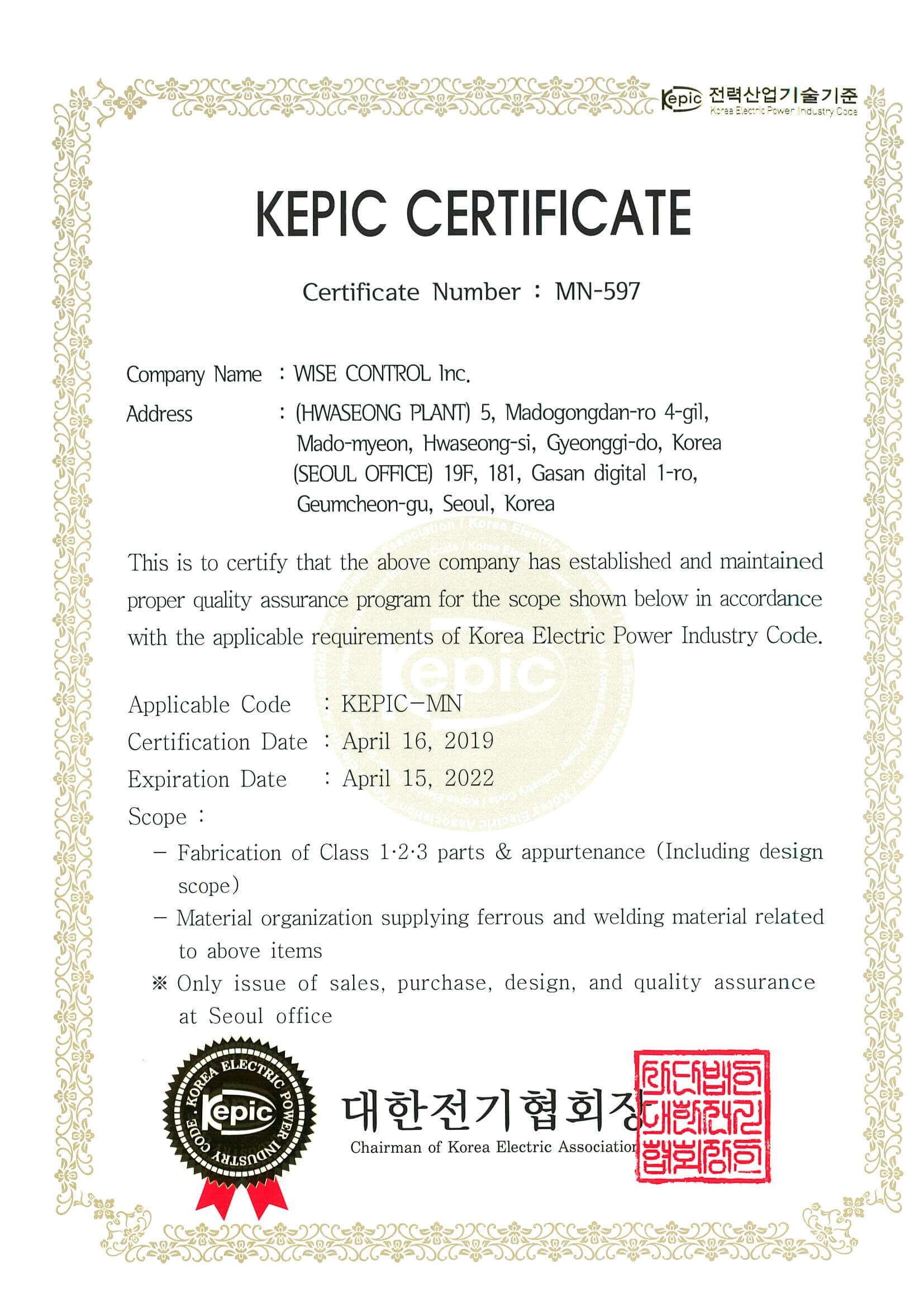 KEPIC Certificate - MN