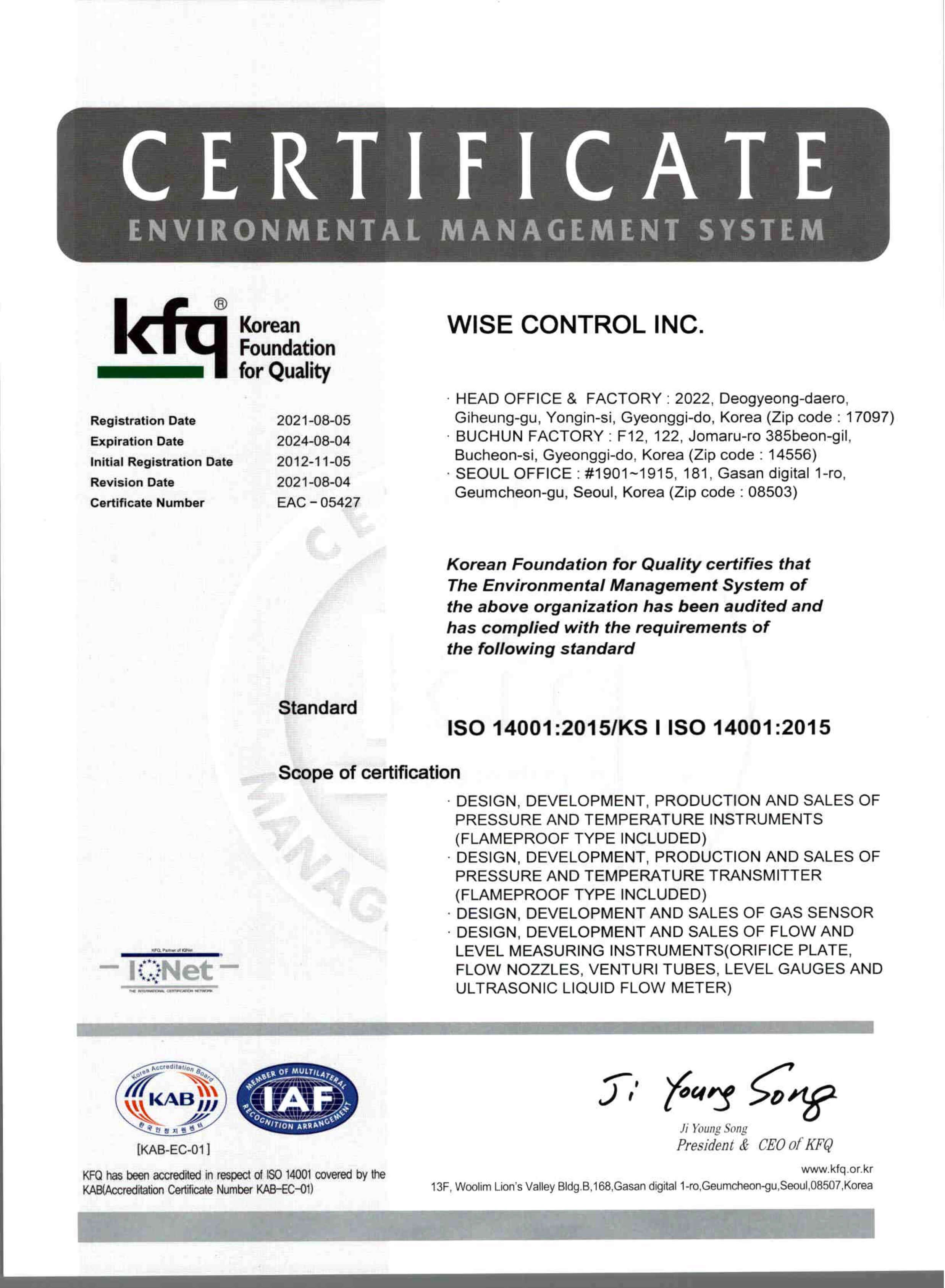 주식회사 와이즈는 각 산업현장의 압력, 온도, 유량을  측정 지시하는 각종 계측제어기 및 지시계를 개발, 생산 및 판매 그리고이에 대한 서비스를 수행하는 업체로서 환경경영의 관점에서 사업 경영을 환경친화적으로 실시할 것이며 "고객만족이 우리회사의 최고가치" 임을 인식하고 고객만족을 통하여 기업발전을 이루며 이를 실현하기 위해 환경영향을 최고경영자와 임직원 모두가 인식하고 지속적으로 실천하기 위한 환경방침을 다음과 같이 정한다.
