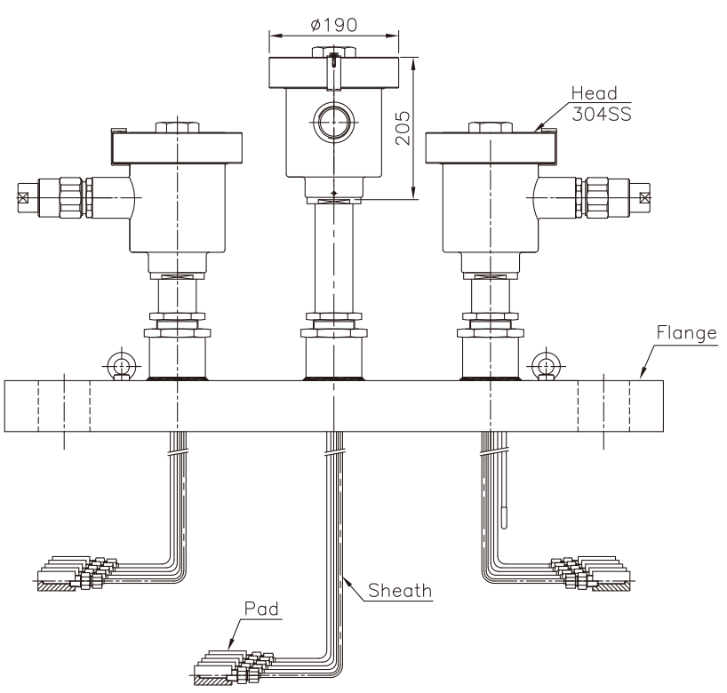 This type of detector is designed to be used in a situation where the user wants to measure the distributed temperature of a reactor or a container. It can measure horizontally distributed temperature and also can measure the temperature in each depth of the container or the reactor. It is also designed to consider the size of nozzle, installation space and requirement, and convenience of repairing and replacing. Wise Control Inc. can manufacture any types of multi point temperature sensors, and upon request of the customer, we can employ the requested material of protection tube, the material of sheath, size, measuring points, and the method of attaching the senor. Espscially, we can provide the temperature sensors without protection tube in a high pressure line by employing our own safety measures. The temperature sensors for junction box to connect the terminal can be manufactured in explosion proof type.